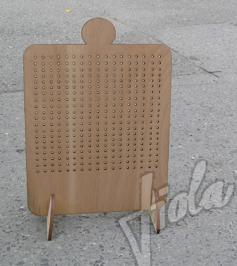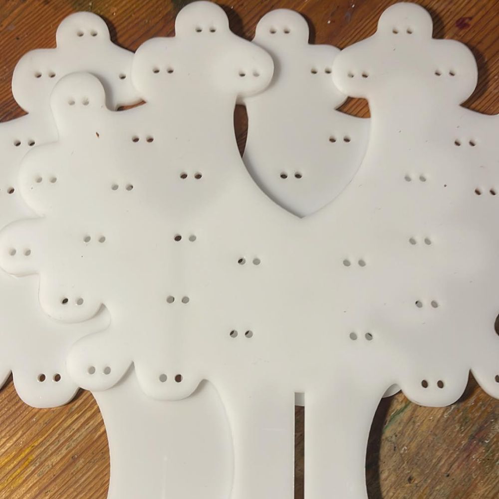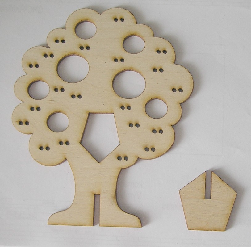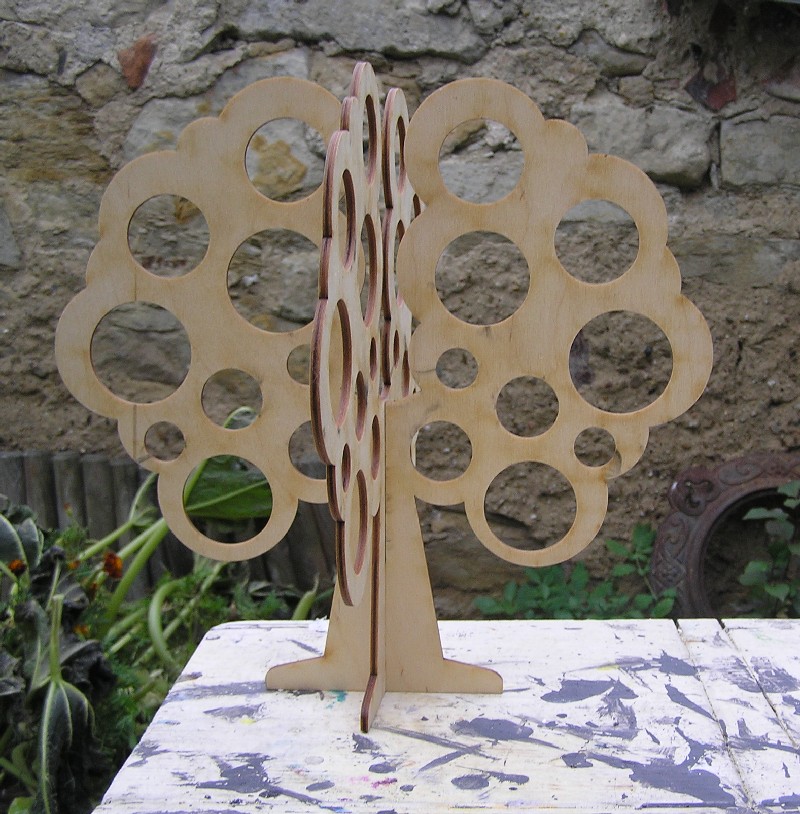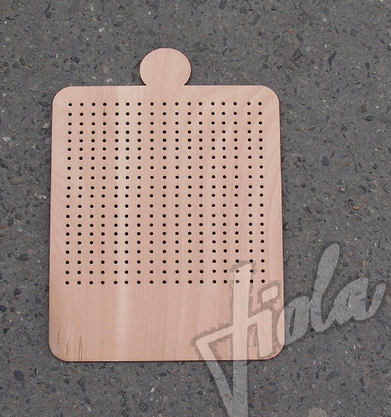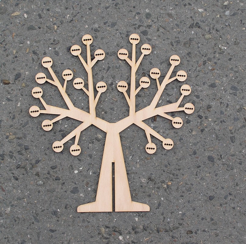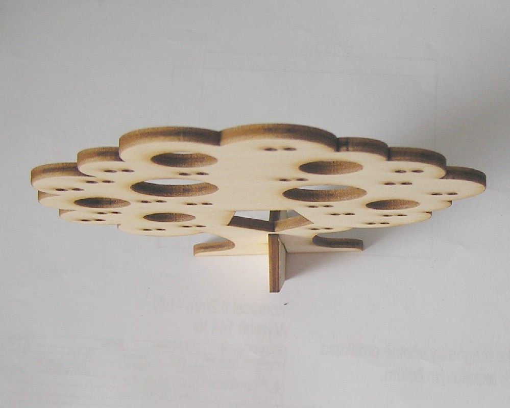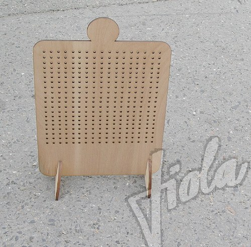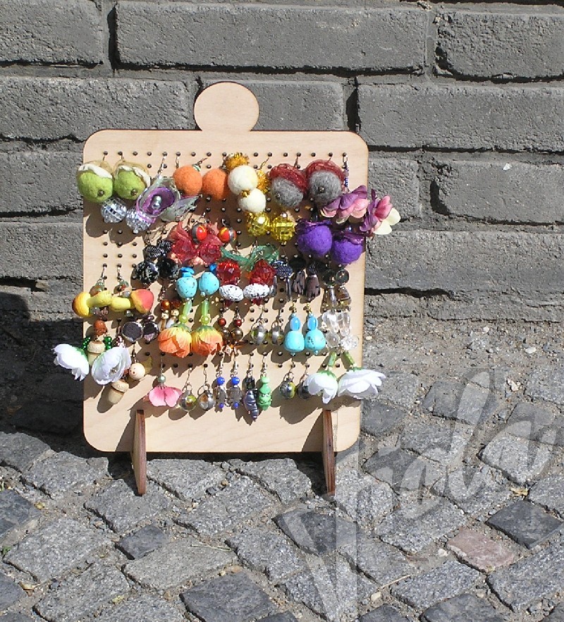 Stojánek na bížu skládací, vysoký cca.40 cm. Skládá se ze dvou částí do sebe zasouvatelných, takže je vhodný na převážení i na jarmarky a do obchodů i domů. Lze jej také zavěsit rozebraný. Obsáhne cca 50 párů náušnic. Materiál je překližka síla 4 mm.