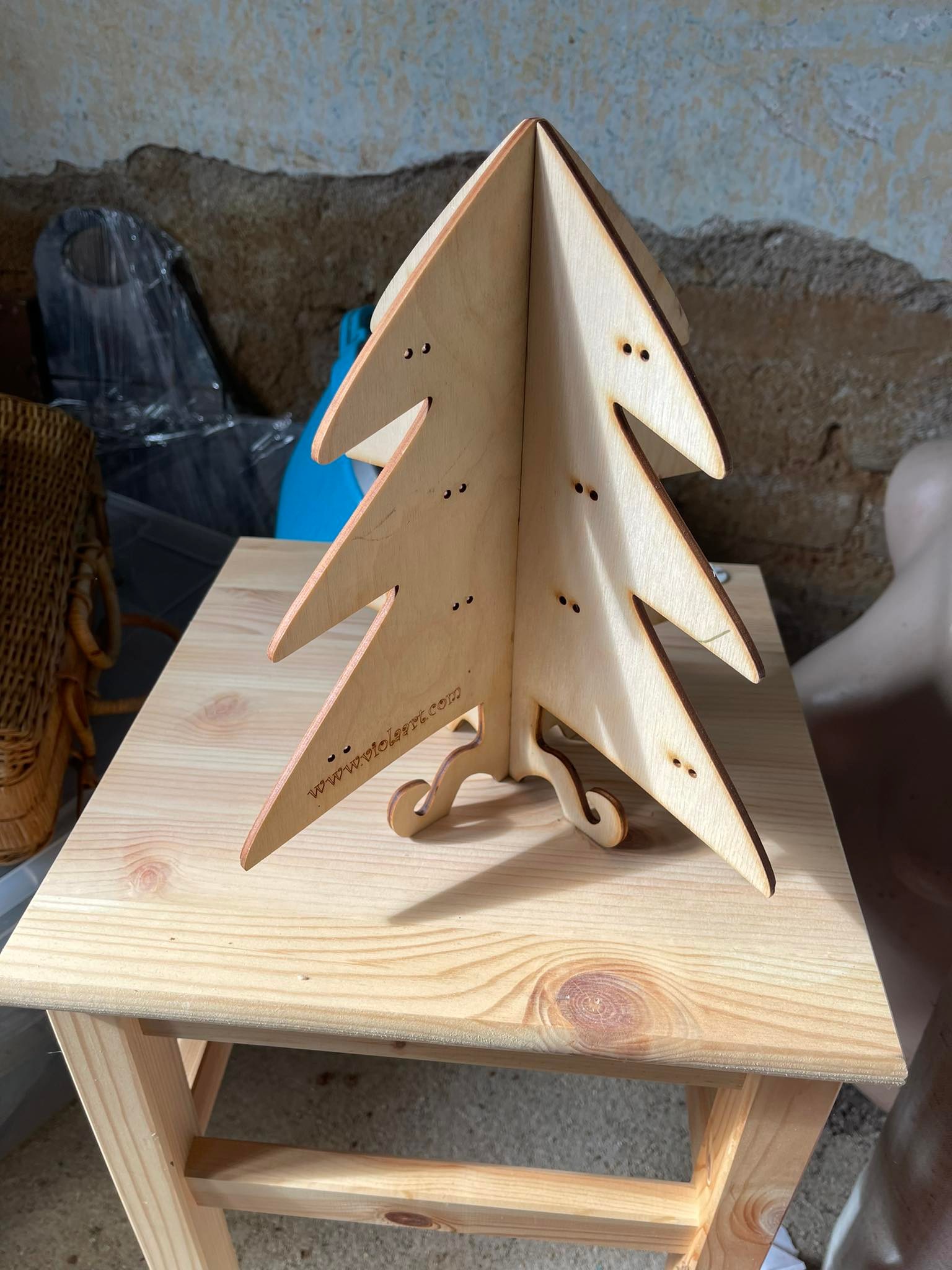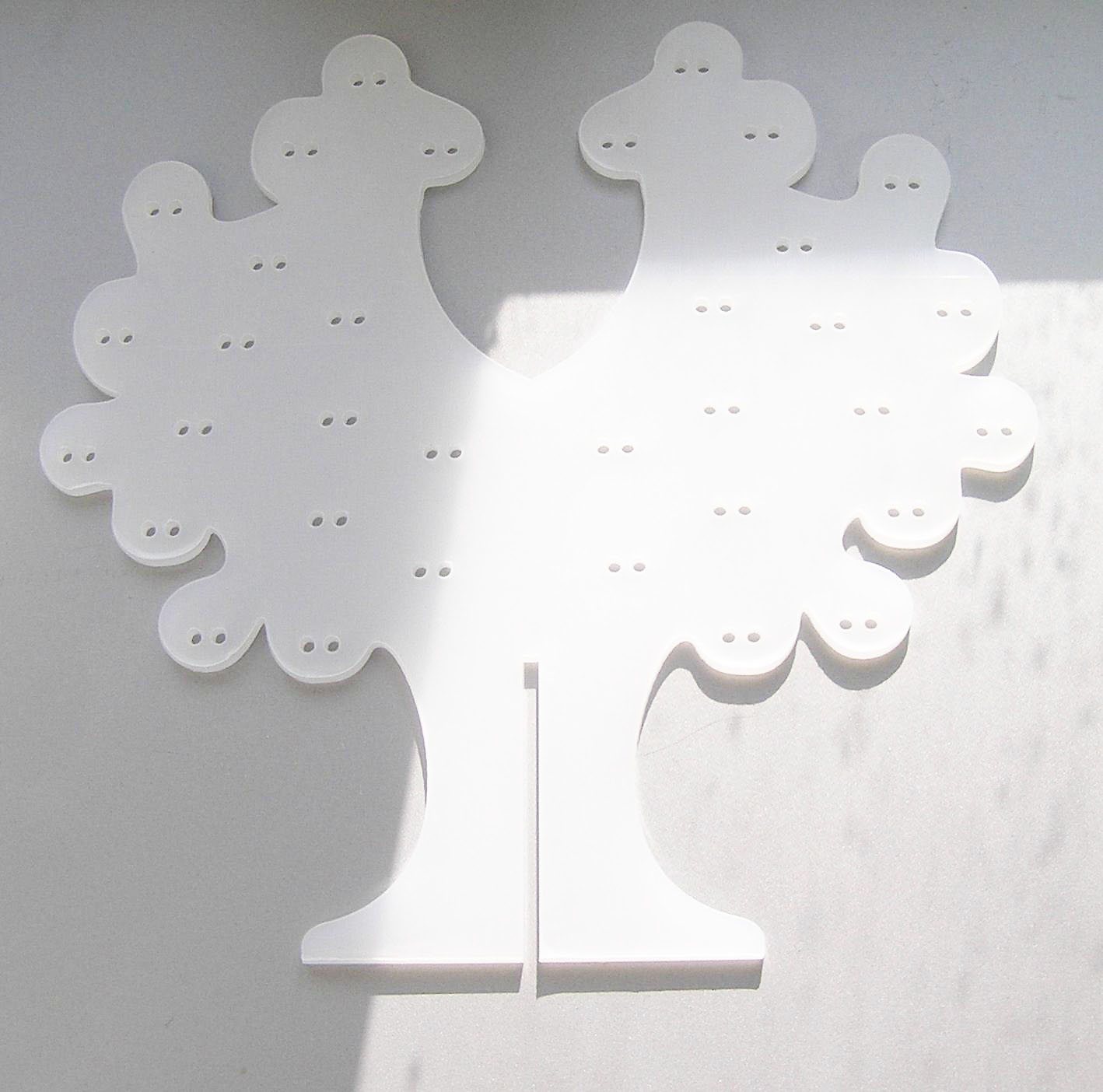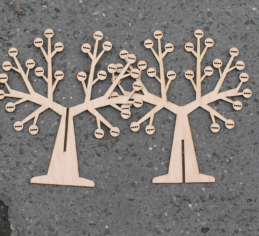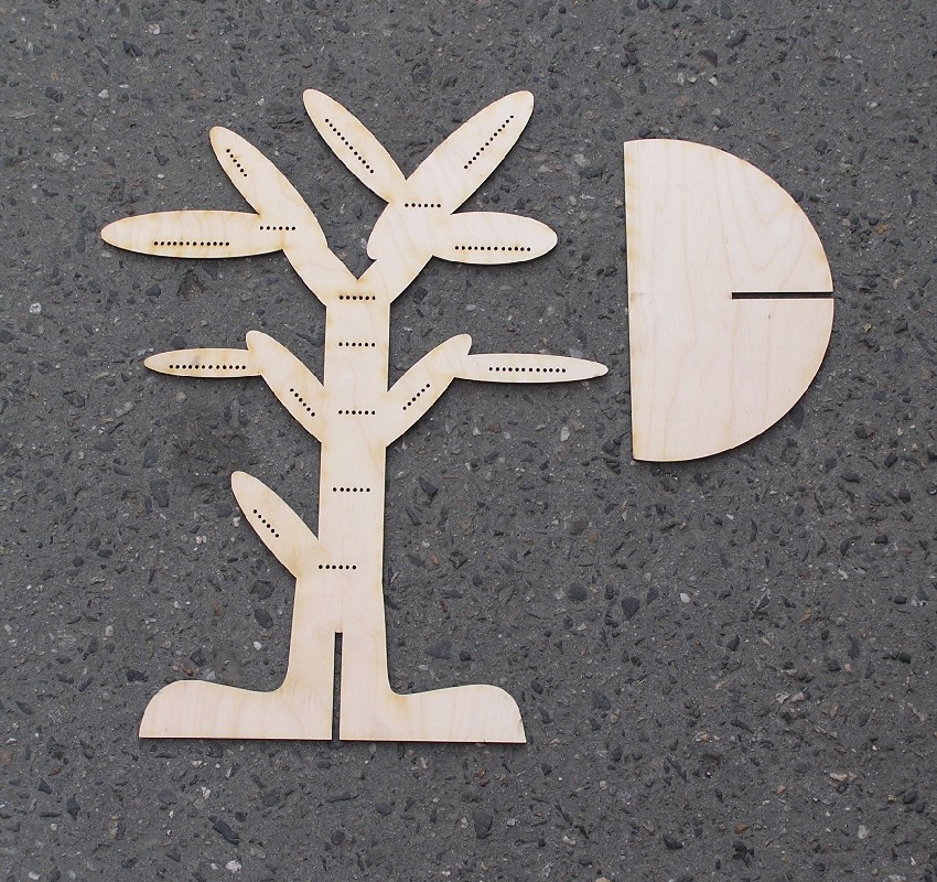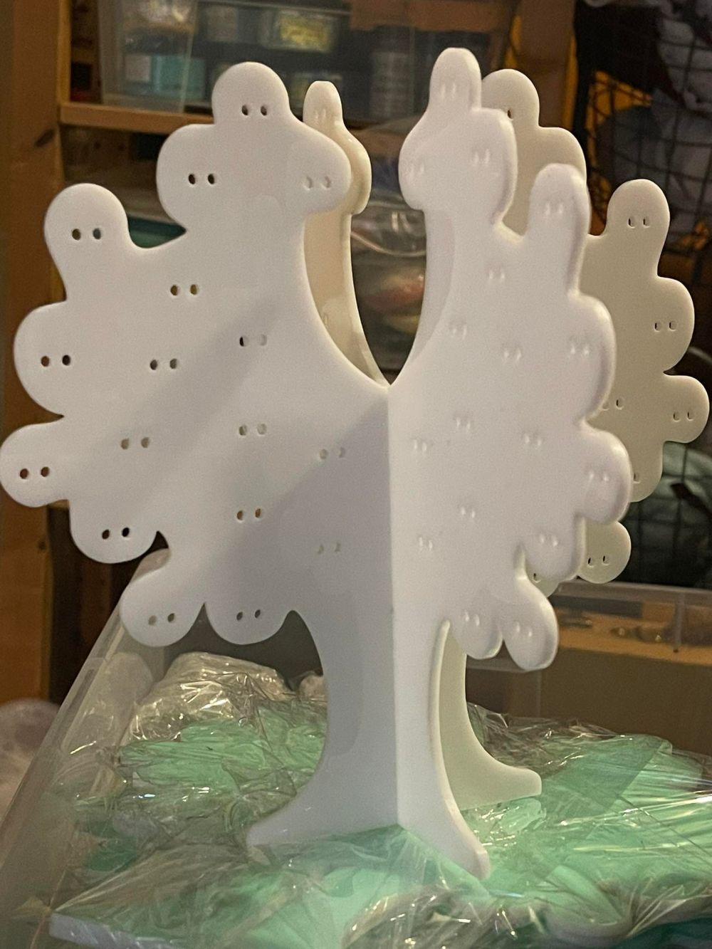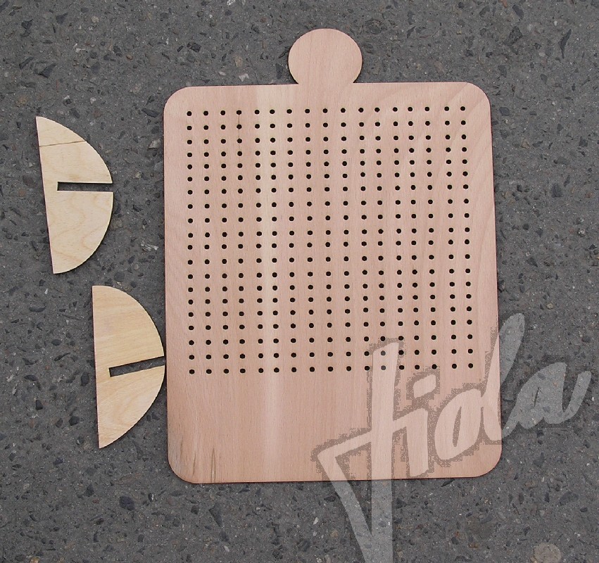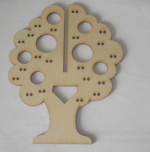 Stojánek na bížu skládací, vysoký cca.40 cm. Skládá se ze dvou částí do sebe zasouvatelných, takže je vhodný na převážení i na jarmarky a do obchodů i domů. Lze jej také zavěsit rozebraný. Obsáhne cca 50 párů náušnic. Materiál je překližka síla 4 mm.
