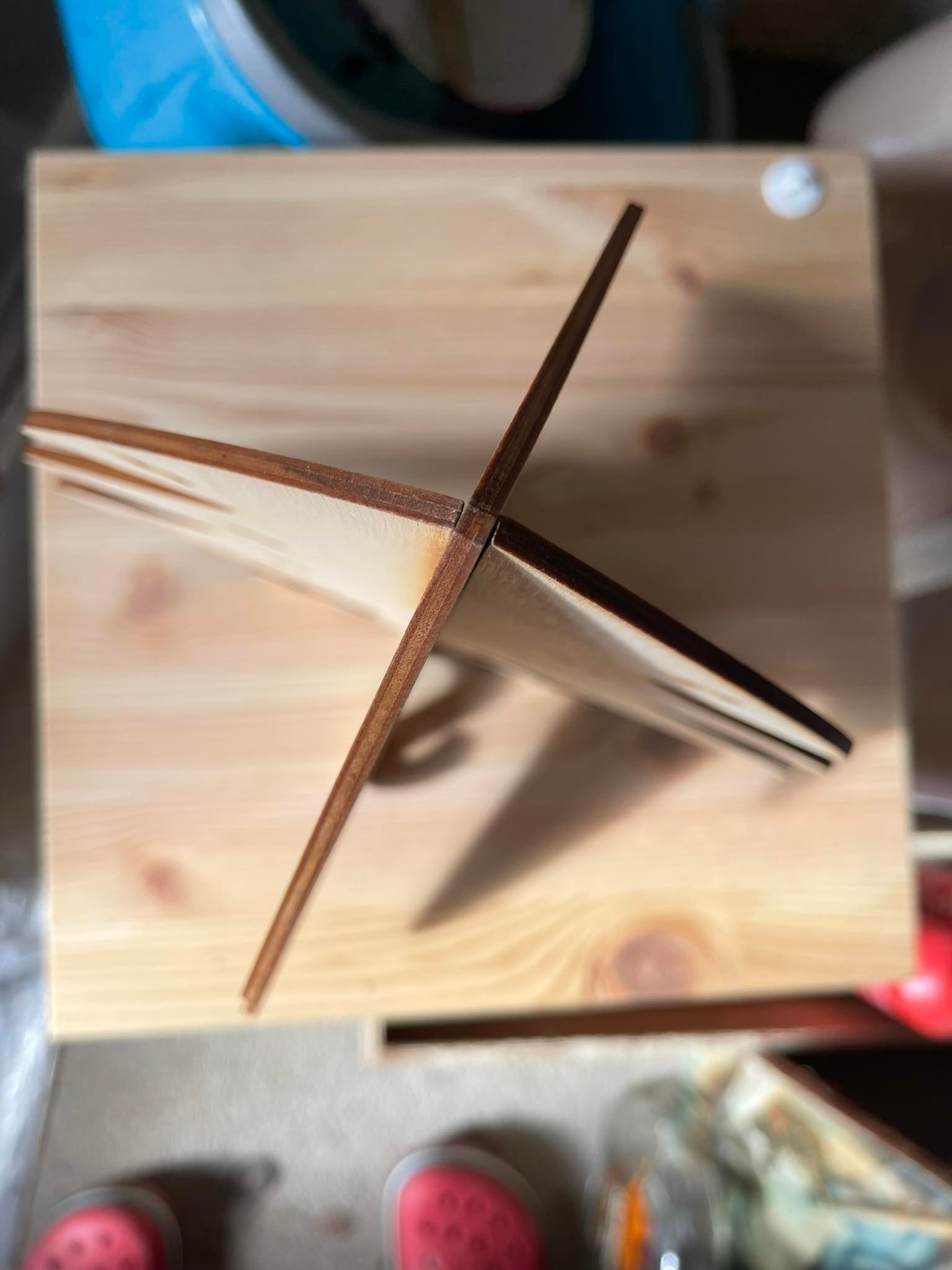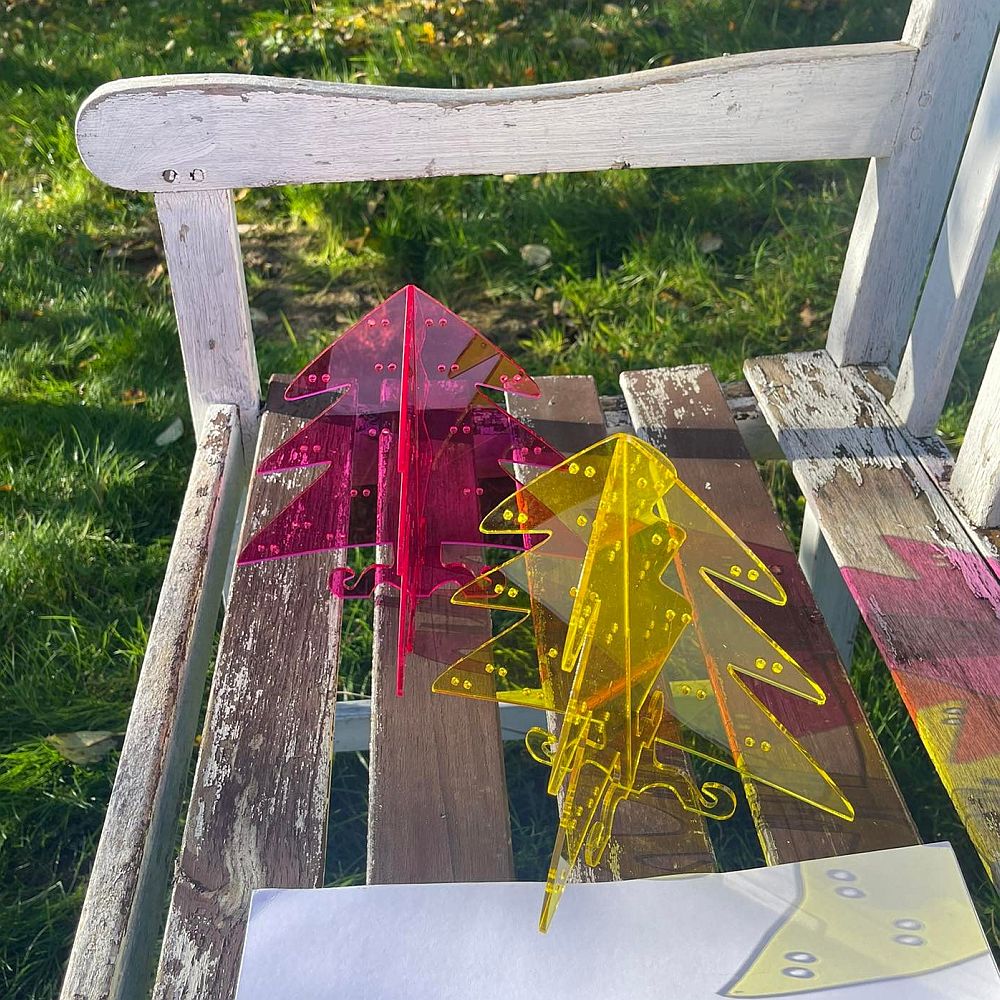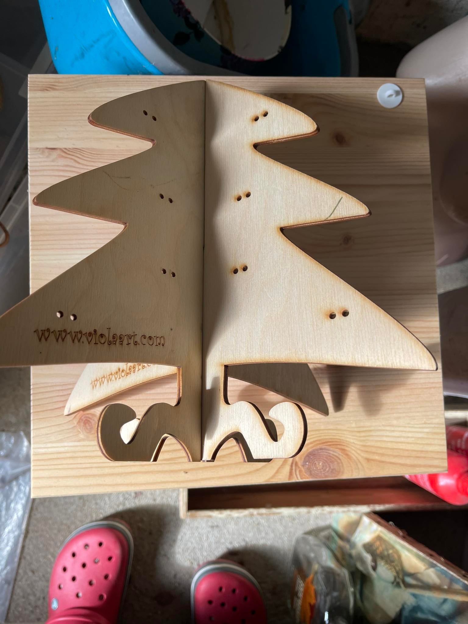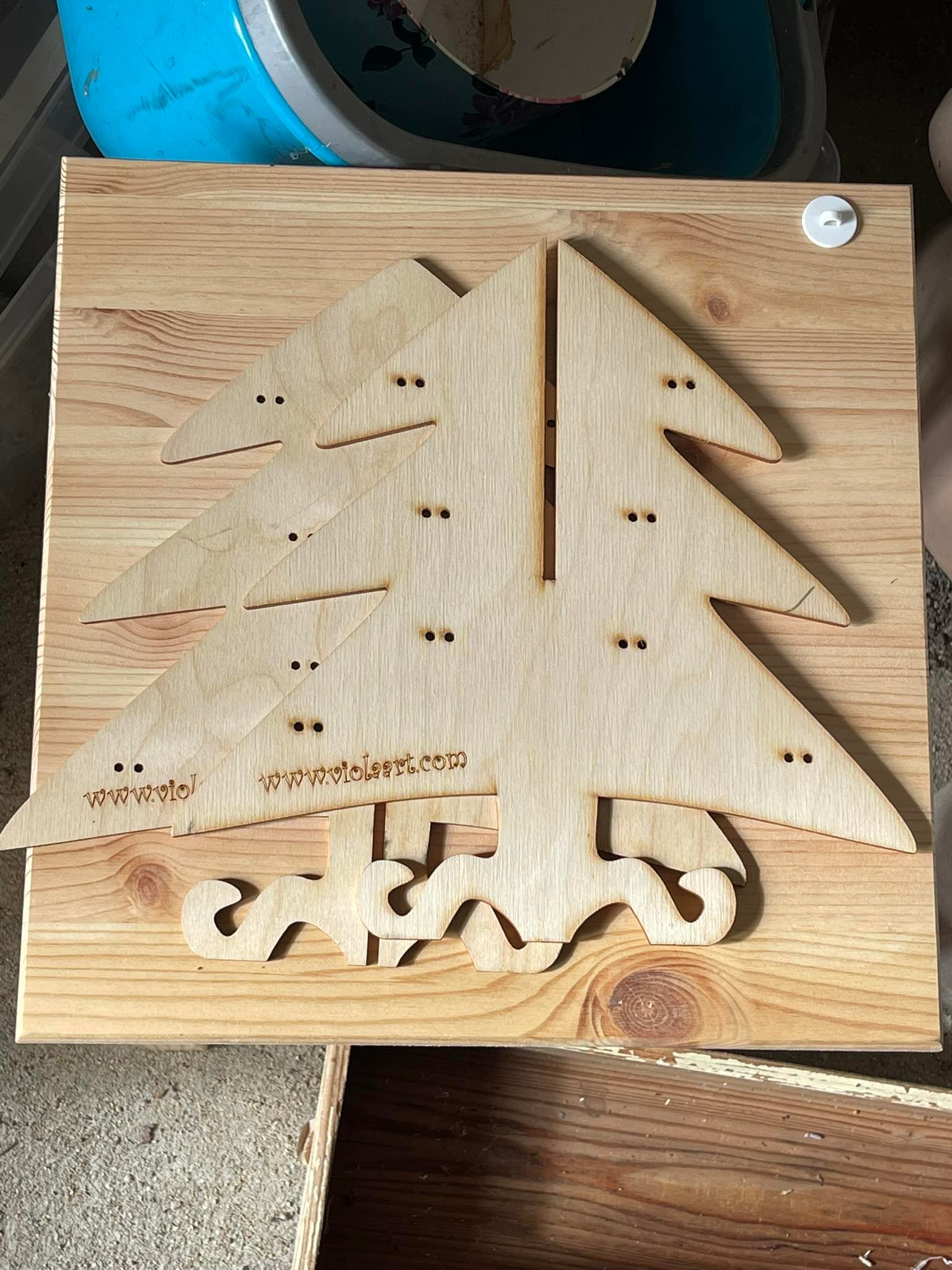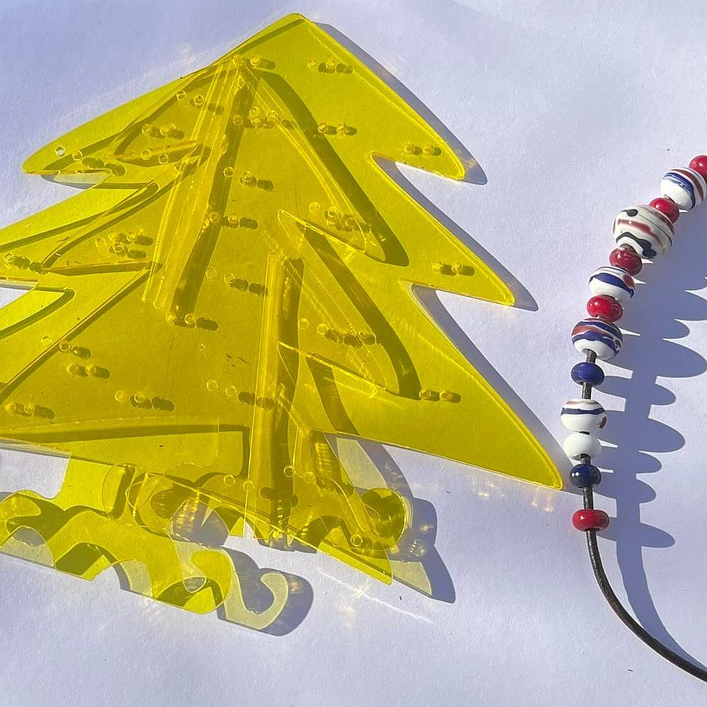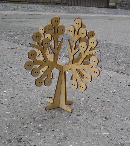 Stojánek na bížu skládací, vysoký cca.40 cm. Skládá se ze dvou částí do sebe zasouvatelných, takže je vhodný na převážení i na jarmarky a do obchodů i domů. Lze jej také zavěsit rozebraný. Obsáhne cca 50 párů náušnic. Materiál je překližka síla 4 mm.
