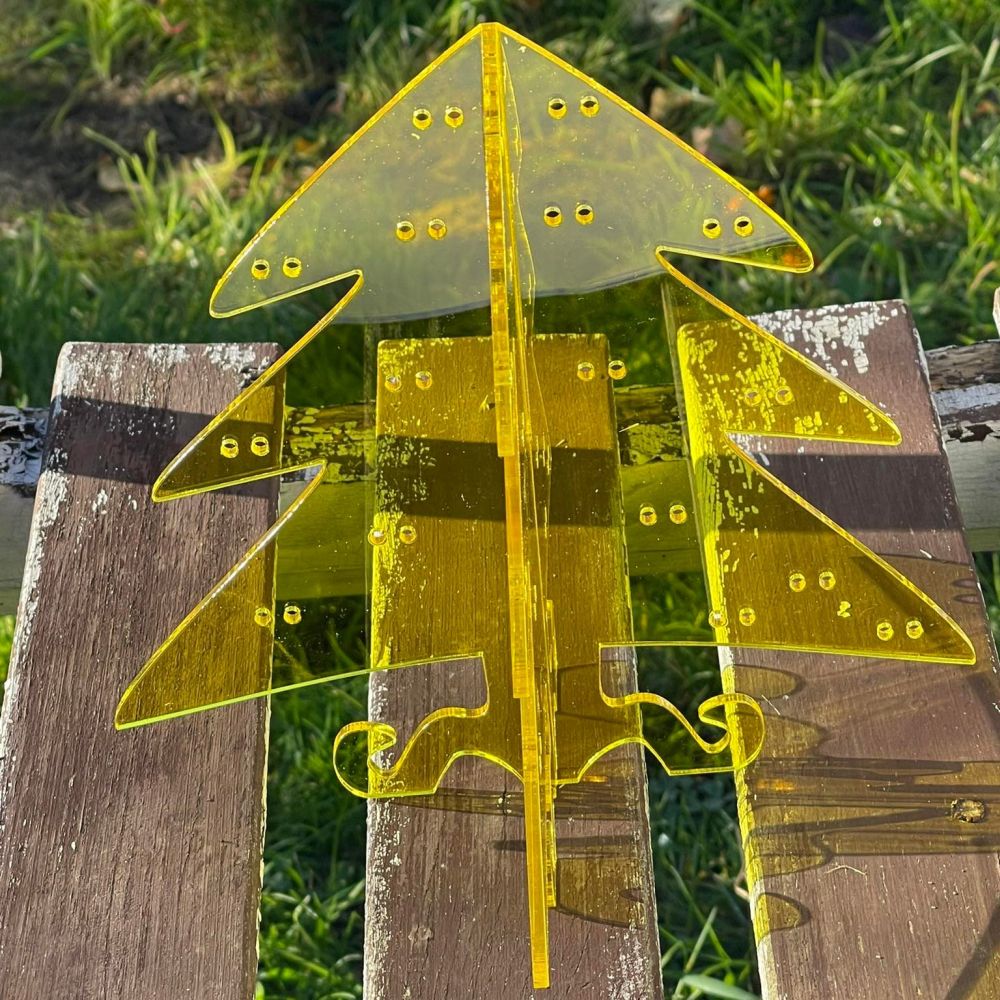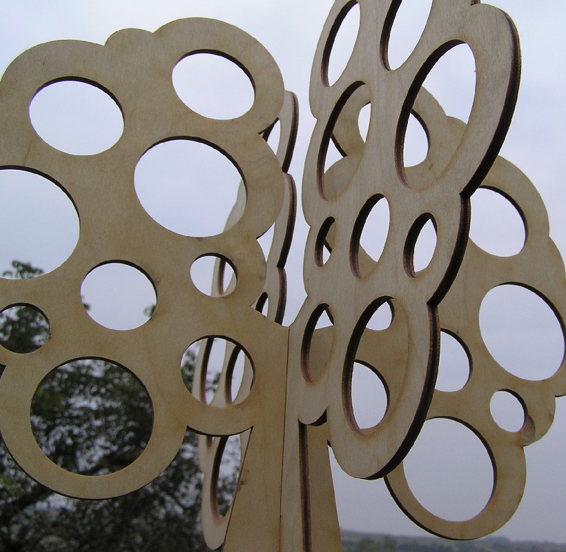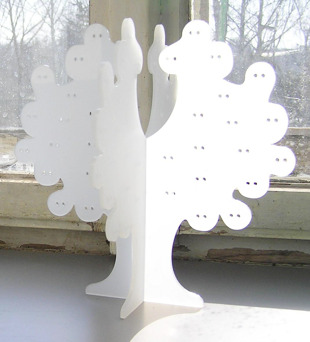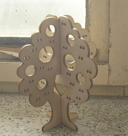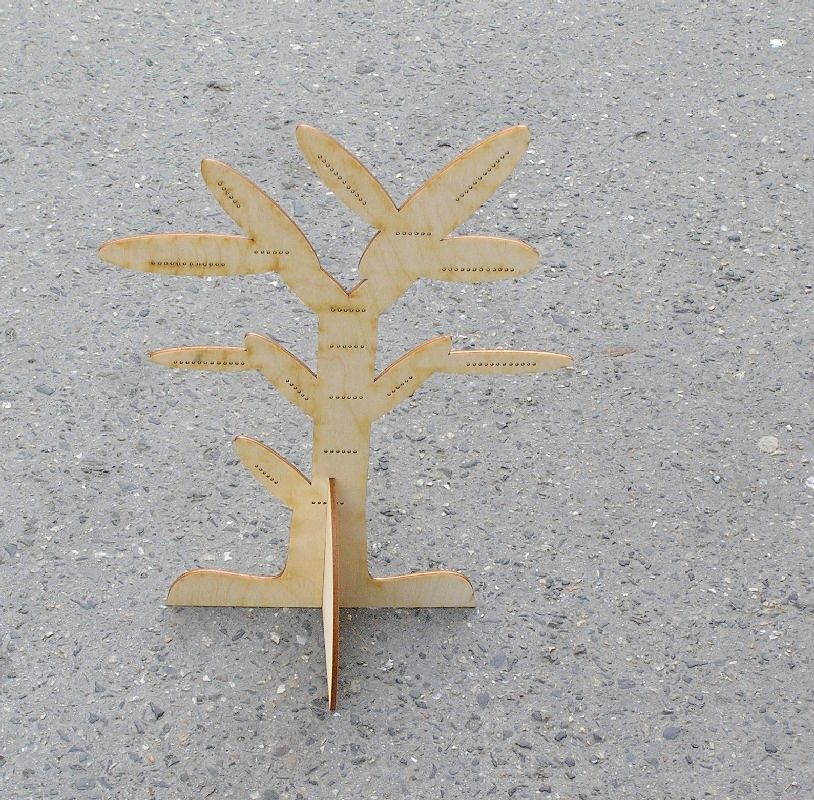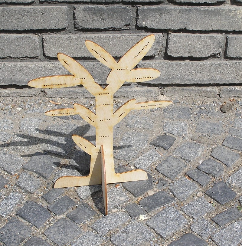 Stojánek na bížu skládací, vysoký cca.40 cm. Skládá se ze dvou částí do sebe zasouvatelných, takže je vhodný na převážení i na jarmarky a do obchodů i domů. Lze jej také zavěsit rozebraný. Obsáhne cca 50 párů náušnic. Materiál je překližka síla 4 mm.
