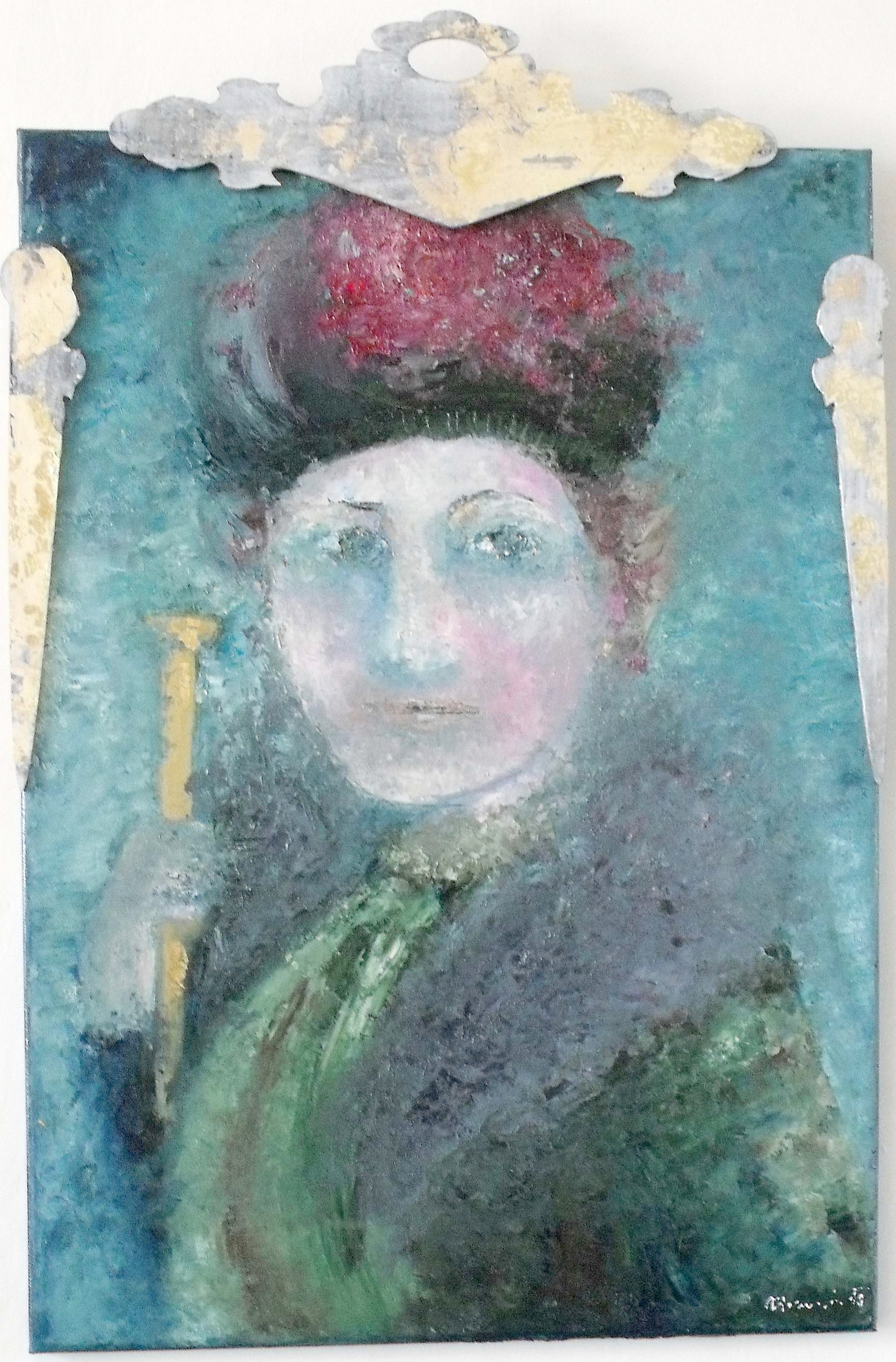 Akryl na plátně 2014 50 x 70 cm. Nerámováno, zdobeno patinovanými tvary.