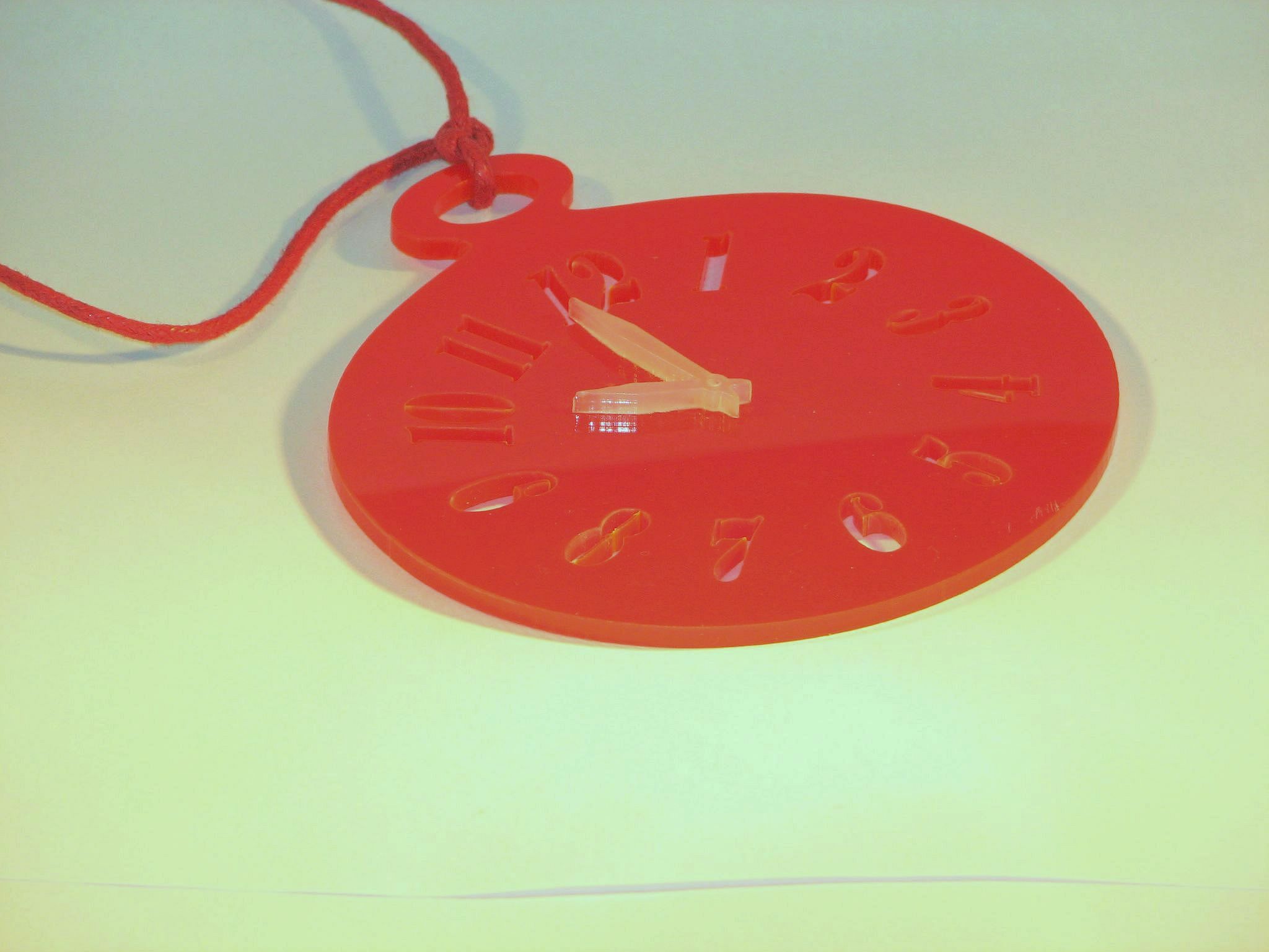 Hodiny z plexiskla zavěšené na bavlněné šňůrce cca. 10 x 10 cm.