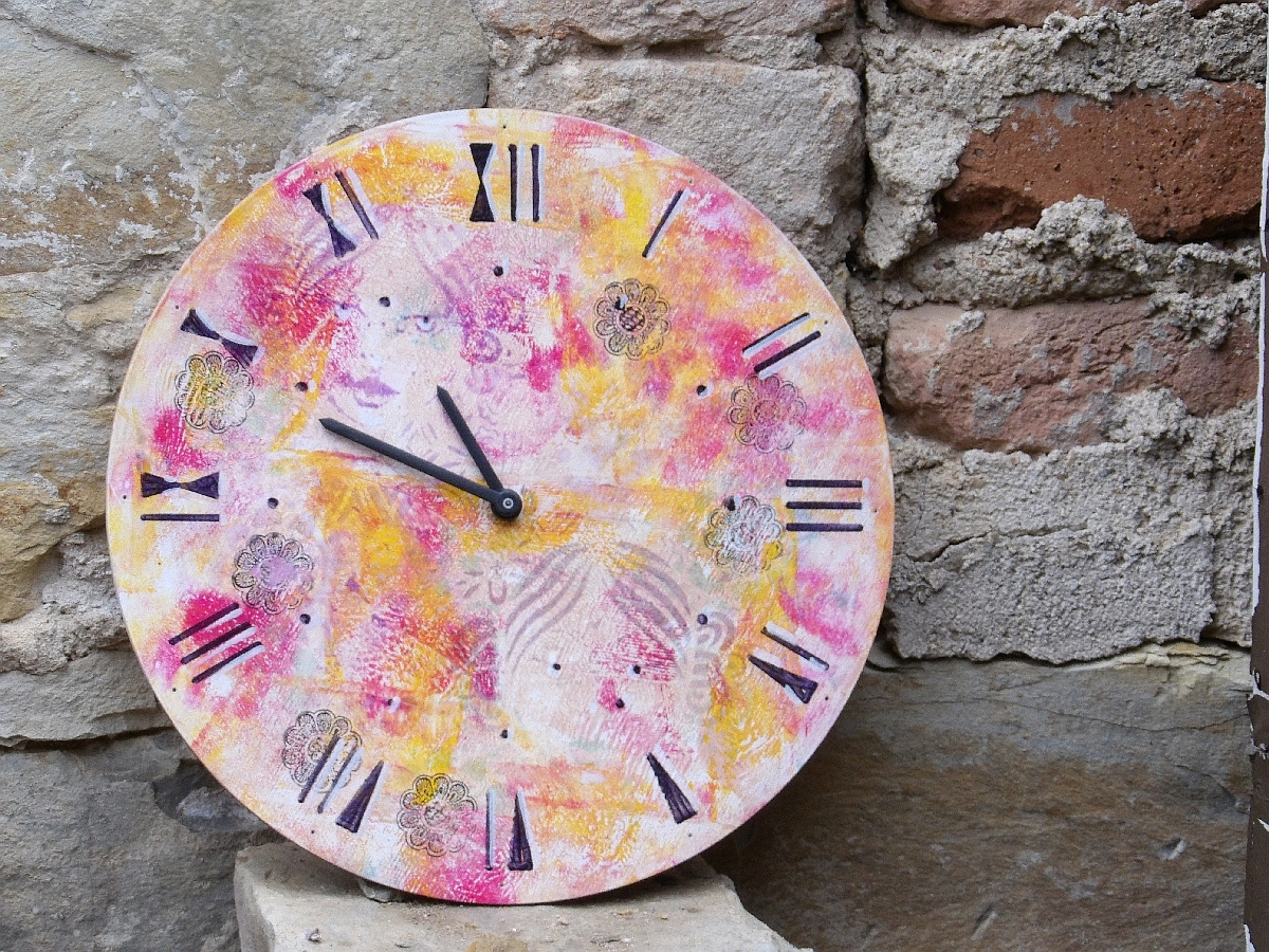 Hodiny průměr 30 cm jsou vyřezány z překližky. Pomalovány akrylovými barvami, barevnými inkousty a…