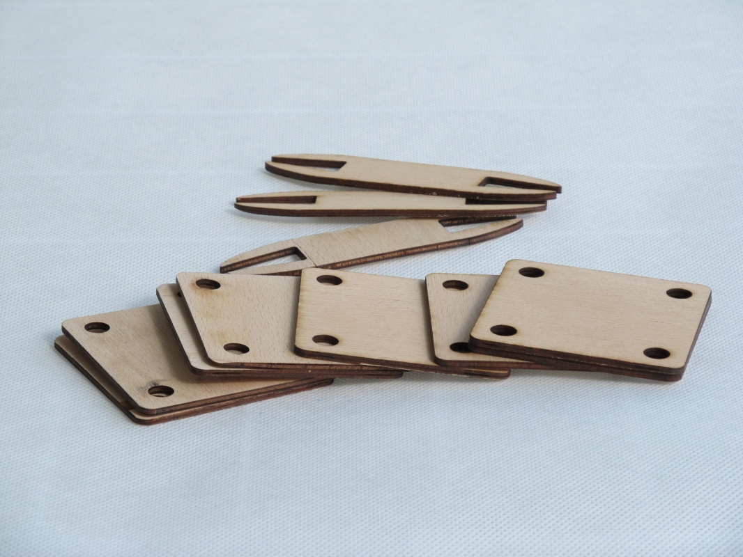 Karetky na tkaní. 8 karetek a 3 člunky . Vyrábíme sami z překližky 3 - 4 mm silné. Velikost je 7 x 7 cm
