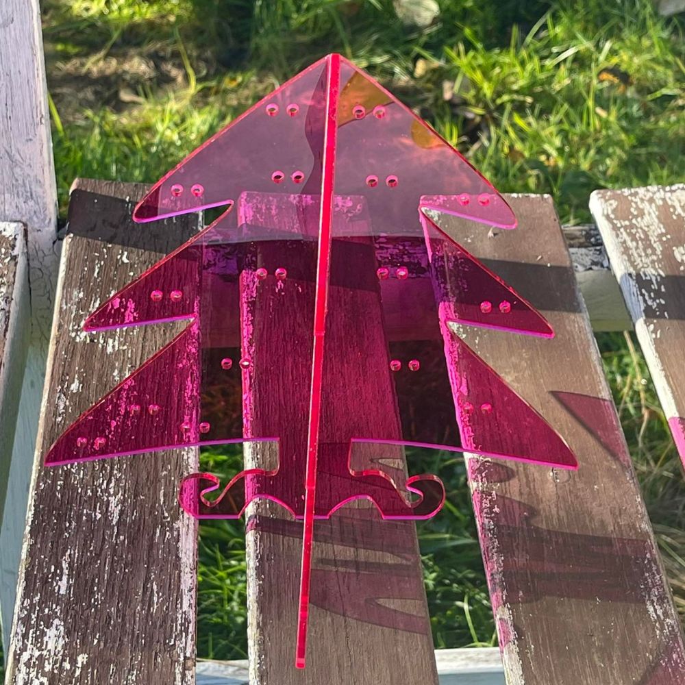 Stojánek na náušnice cyklámen ViolaArt skládací smrček, vysoký cca.20 cm. Skládá se ze dvou částí do sebe zasouvatelných, takže je vhodný na převážení i na jarmarky a do obchodů i domů. Lze jej také zavěsit rozebraný. Obsáhne 30 párů náušnic. Materiál je plexisklo - satén síla 4 mm.