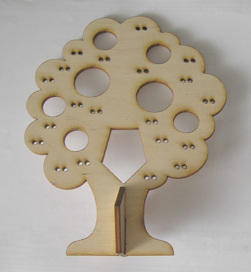 Strom -Stojánek na bížu skládací, vysoký cca.18 cm. Skládá se ze dvou částí do sebe zasouvatelných, jedna slouží na náušnice a ta druhá jako podstavec. Obsáhne 20 párů náušnic i více. Materiál je překližka síla 4 mm.