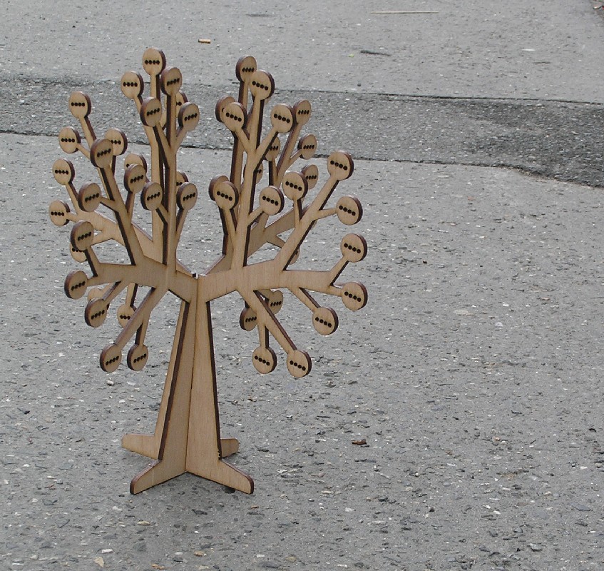 Strom -Stojánek na bížu skládací, vysoký cca.29 cm. Skládá se ze dvou částí do sebe zasouvatelných, takže je vhodný na převážení i na jarmarky a do obchodů i domů. Lze jej také zavěsit rozebraný. Obsáhne 114 párů náušnic. Materiál je překližka síla 4 mm.