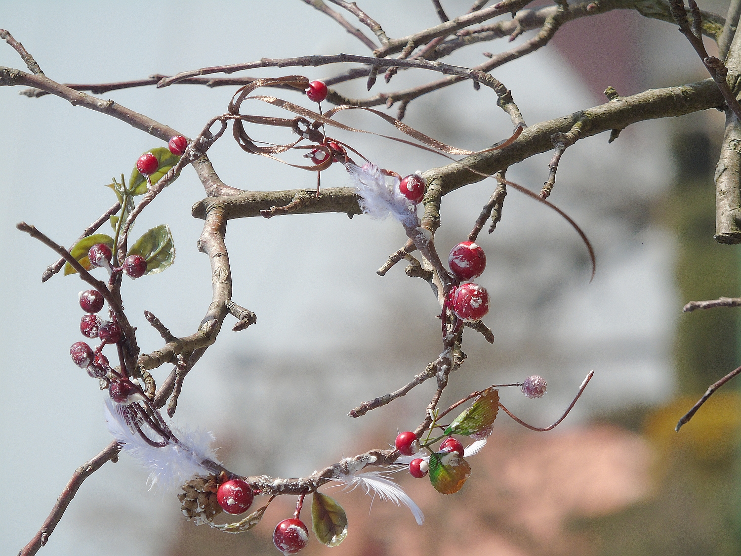 Bílá peříčka, ojíněné bobule, šištičky a lístky jsou upevněny na kovový základ, drátky. Základ je důkladně omotán floristickou páskou, tak aby vše budilo dojem větvičky. Velikost věnečku se dá upravit stužko